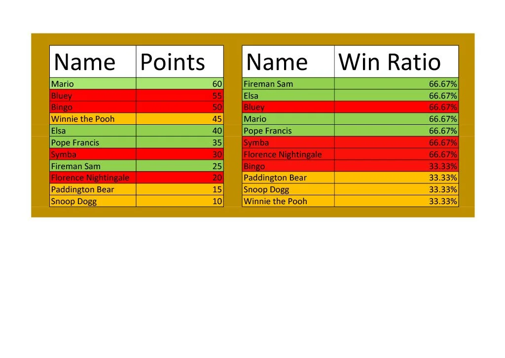 I have designed this system and the points system (shown below) with the intention that a child who joins at 7 (at the Red Ball Stage) will have to compete over many years to reach a black band, but also, such that if a child comes and joins the League when they are 13/14 (Yellow Ball 1 or 2), if they are dedicated enough, they should be able reach a black band by the time they are 16/17 too. The scoring system also reflects how I expect children to mature as they go through the ball stages, with younger children receiving nearly the same amount of points for winning and loosing, whereas in the older age brackets there is more reward for being the victor.